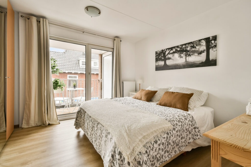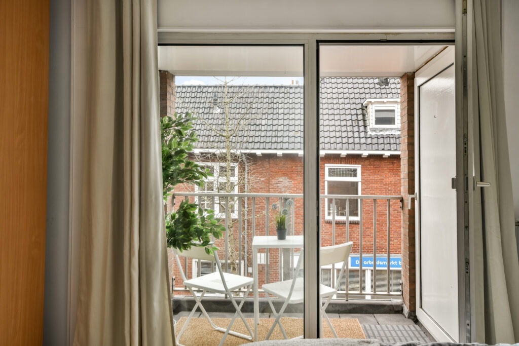 De slaapkamer beschikt over een grote vaste kledingkast (blijft achter) en geeft direct toegang tot het fijne balkon op het oosten (ca. 2.89 m²). Hier geniet je in alle rust van de ochtendzon. Op het balkon bevinden zich bovendien twee inbouwkasten, waarvan één met de cv-ketel.