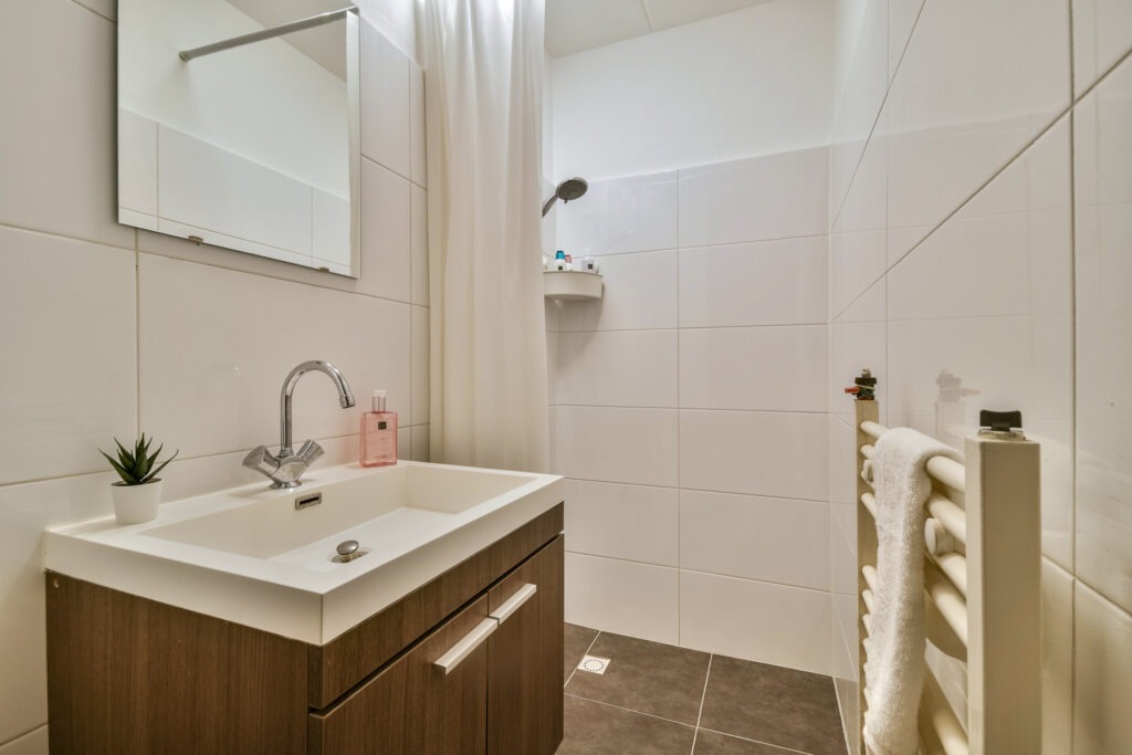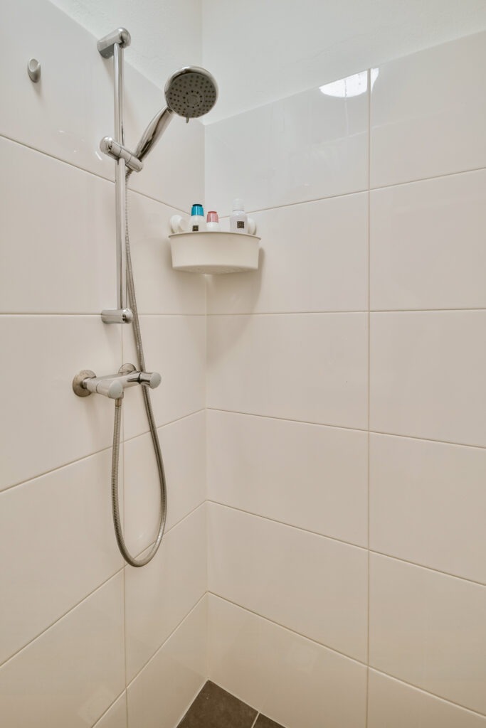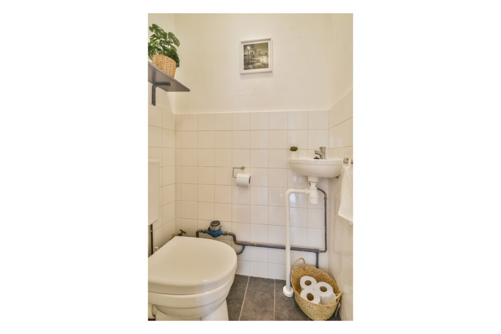 De compacte, nette badkamer is uitgerust met een douche en wastafelmeubel. Het toilet is separaat en verzorgd.