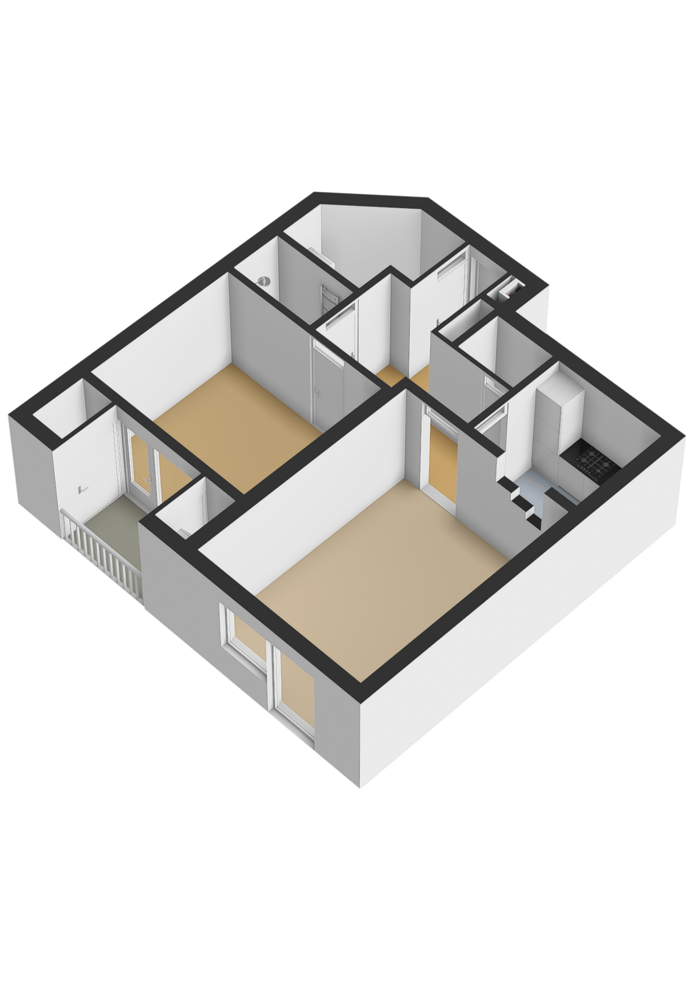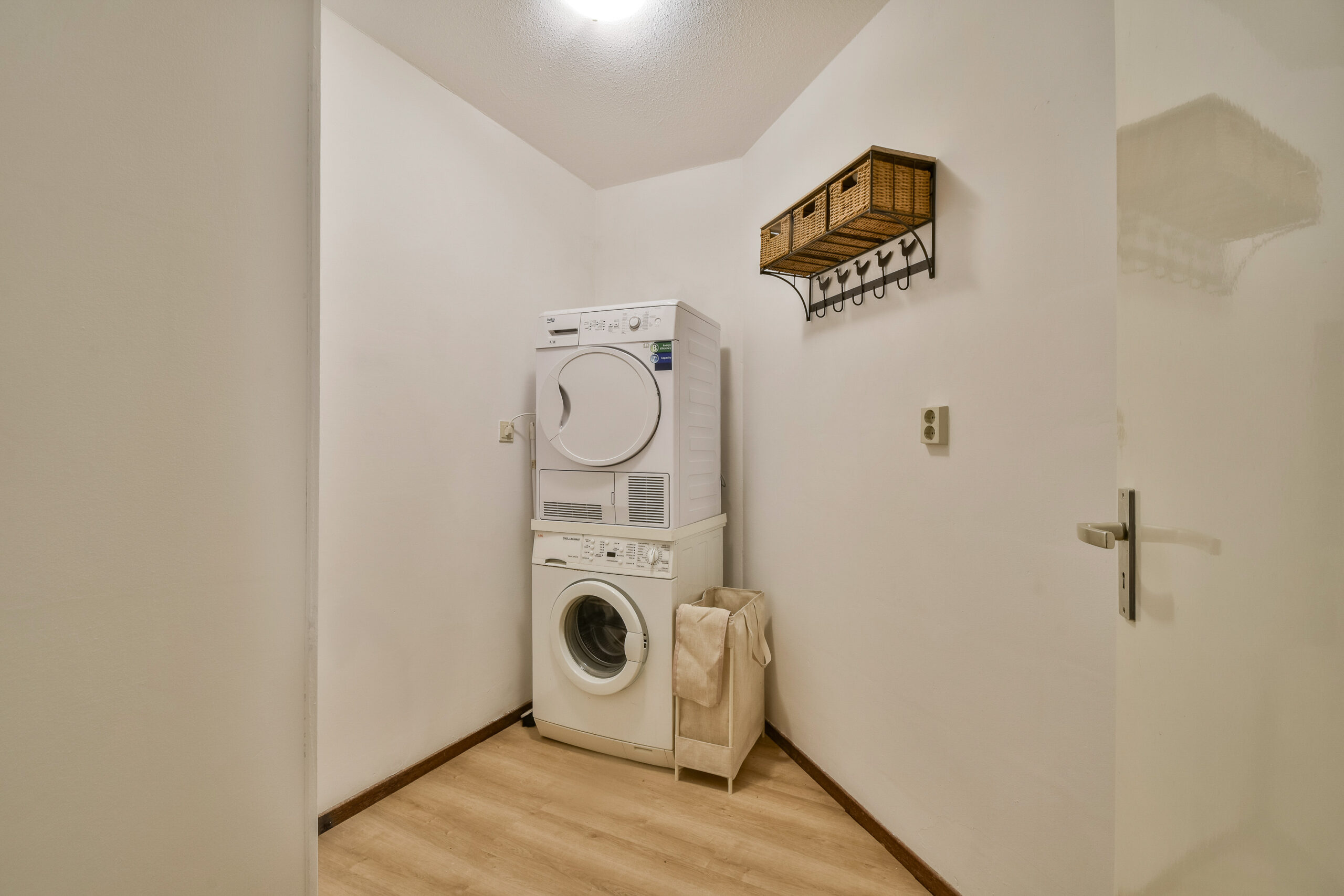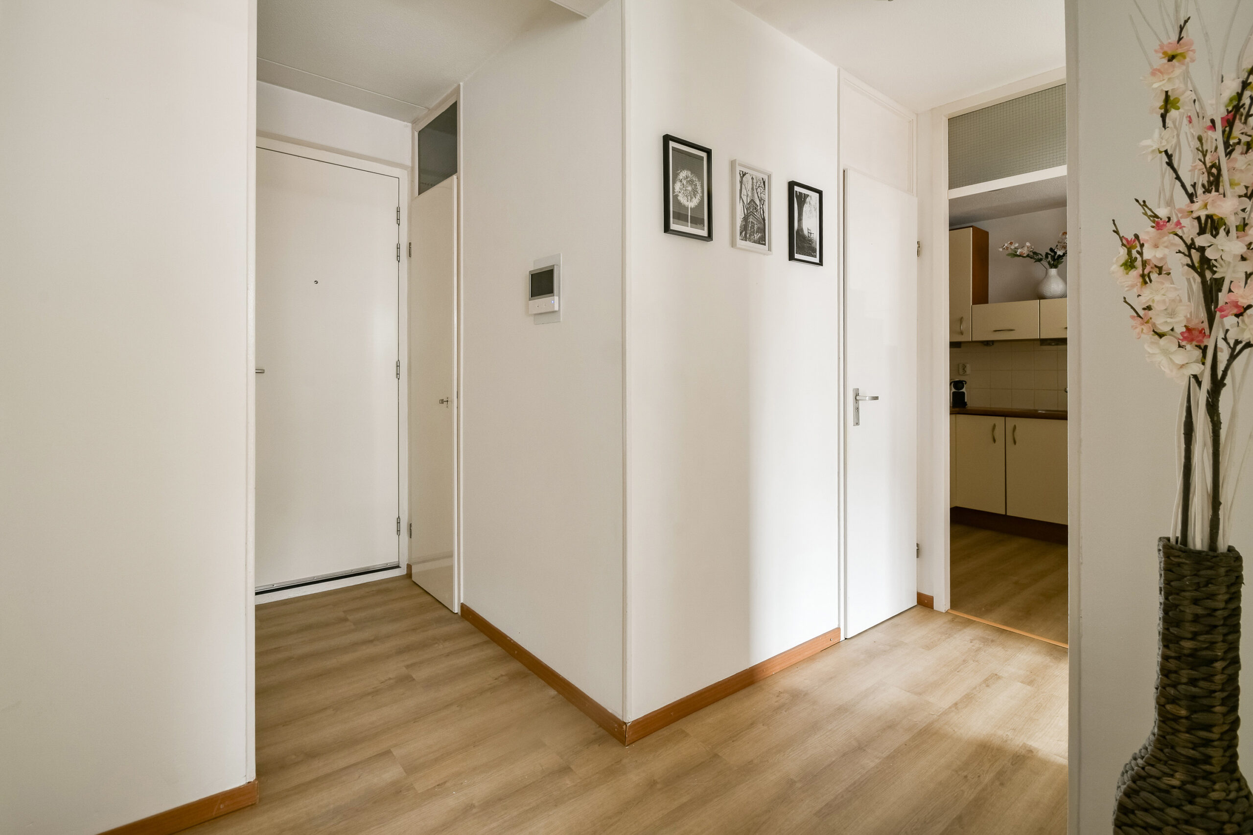 Via de galerij bereik je de entree van het appartement. De hal is voorzien van een intercom en meterkast en geeft toegang tot alle vertrekken. Er is een handige inpandige berging met wasmachine- en drogeraansluiting.