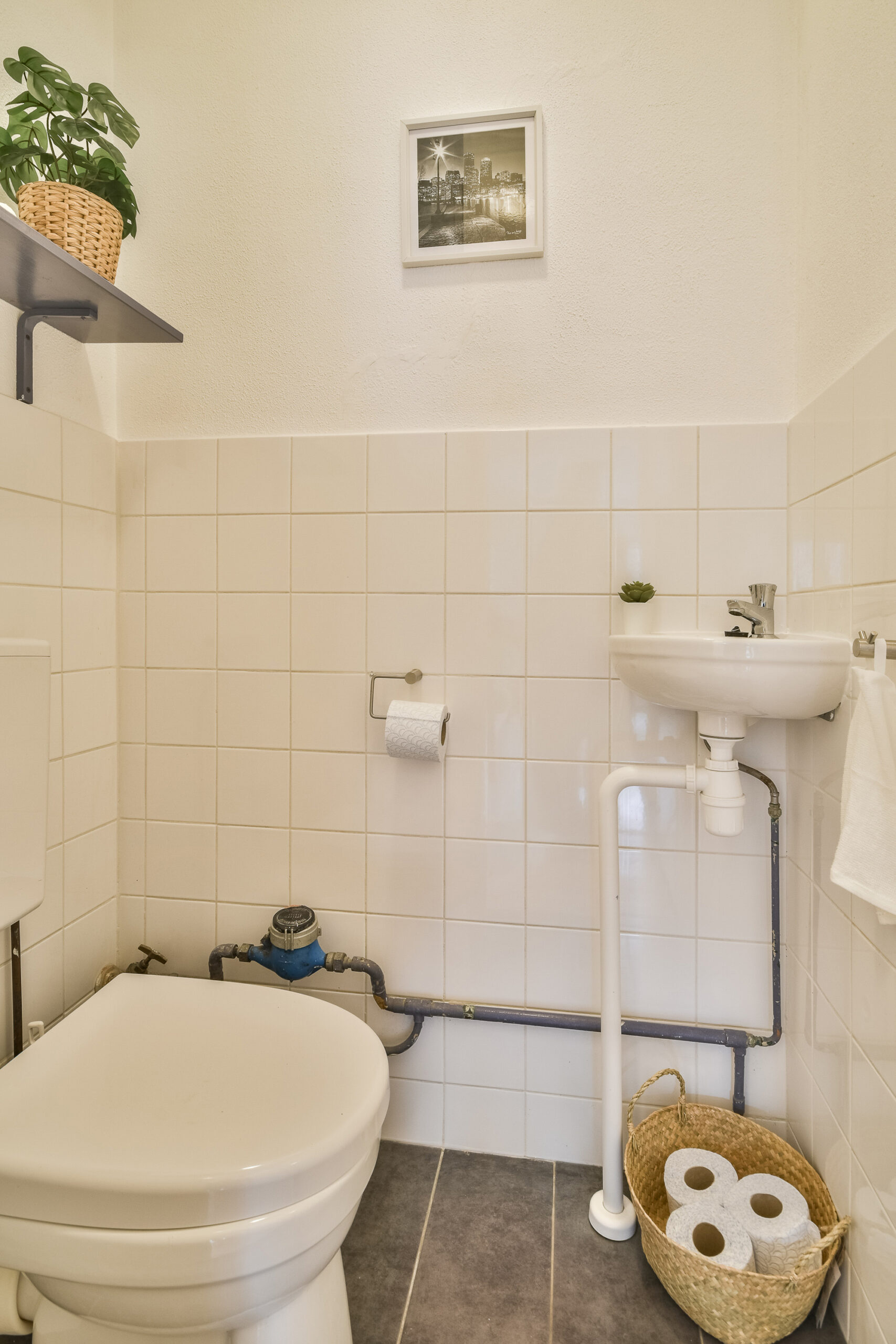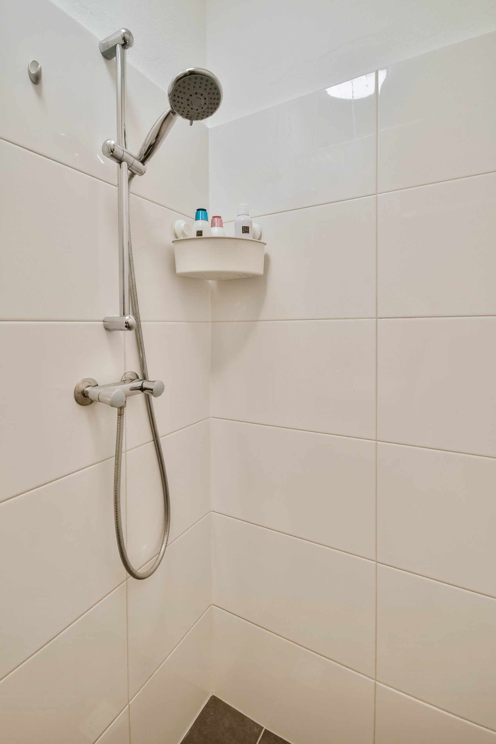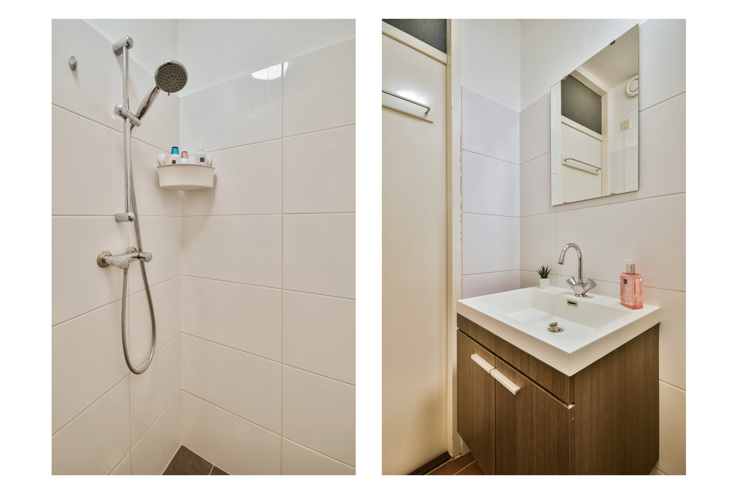 De compacte, nette badkamer is uitgerust met een douche en wastafelmeubel. Het toilet is separaat en verzorgd.