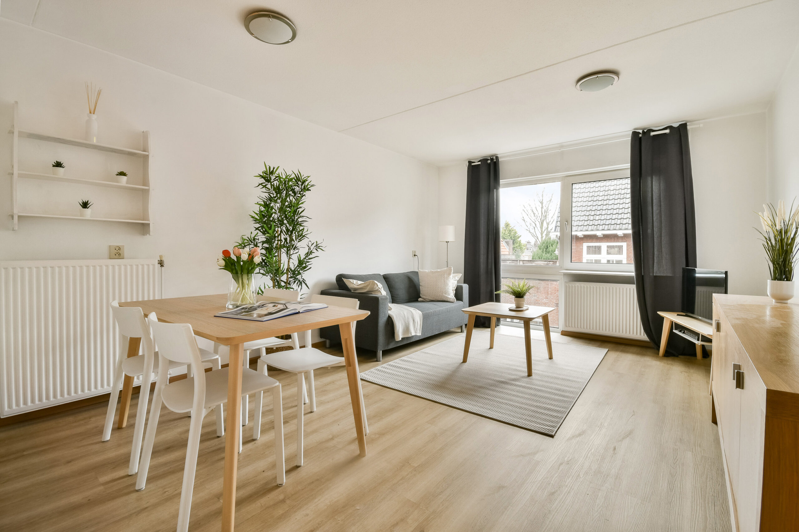 De gezellige woonkamer is sfeervol en biedt voldoende ruimte voor een comfortabele zithoek en eettafel.
